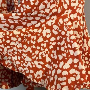 This is such a cute and Slowey mini skirt. The waistband is a wider waist span with elastic and a drawstring. This skirt is also lined. The print is a very modern take on a cheetah print/leopard print. It is in rust orange background with a cream print.
