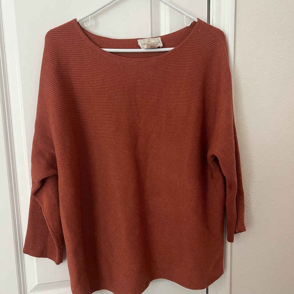 Cozy up in this beautiful burnt orange Belle France sweater, perfect for fall and layering year-round! Features a soft knit texture, relaxed fit, and timeless style that pairs well with jeans, leggings, or skirts.