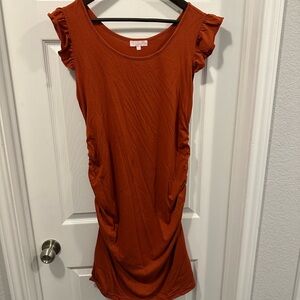 Chic rust orange dress with ruffle sleeves. Perfect for any occasion.