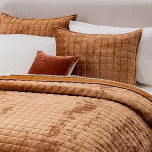 Rust Orange Soft Quilted Squares Velvet Bedding Set Queen Size Bed Quilt & Shams