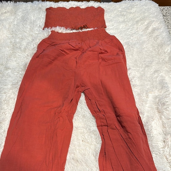 two-piece set. Features a strapless ruched top and matching pants. Perfect vacation!