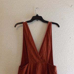 Supercute pinafore jumpsuit. Wideleg, slightly cropped pants. Plunging neckline. Functional tortoiseshell-look buttons. Surprisingly comfy. I want to call the fabric a gauzy cotton, but it's not sheer or ethereal. It has a nice weight & natural texture. Bought secondhand online, and didn't notice it had a tear/hole just to the side of the fly. I let it sit around on a hanger for two months, feeling stupid, thinking maybe I'd wear it under a sweater before deciding to cut it into a pinafore top.First, I tried it on. It was so cute that I had my Mom sew up the tear. The stitching is visible on the outside but I think I did a really good job finding thread in a matching color. See photos.