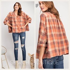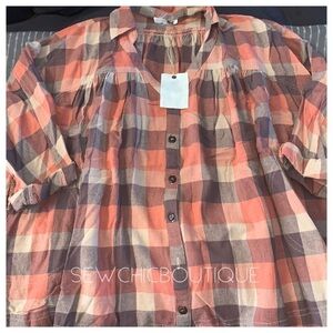 Faded Rust is the color used to describe this top by the manufacturer. This is a long sleeve plaid oversized button down shirt. It has roll up sleeves, a cutout V-neckline with a collar, distressed, frayed hem, & button closure. Extra buttons provided. The top is soft & there are inside pockets in the shirt on each side, on the unfinished seam line.