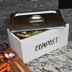 BelleMark Kitchen Compost Bin- 1.6 Gal Rust Proof Stainless Steel Insert, Countertop Compost Bin with Lid and Farmhouse White Wood Box - Indoor Compost Bin Kitchen Counter