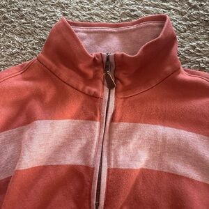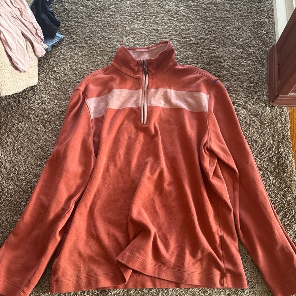 Stylish rust-colored quarter-zip pullover. Features a contrasting stripe across the chest.