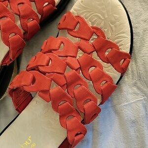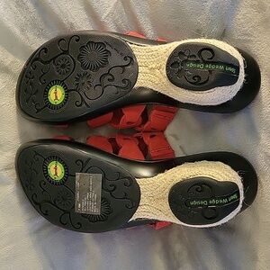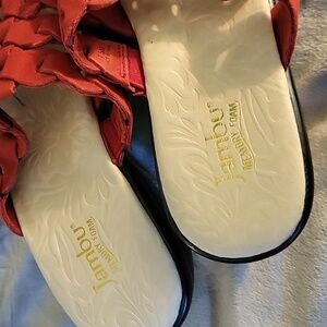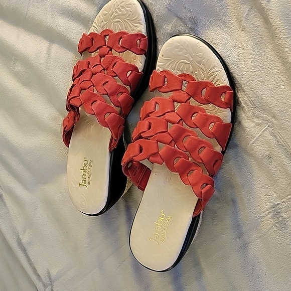Beautiful, never-worn Jambu sandals. Fit is true to size. Heel is approximately 2". Color is a rusty-red.