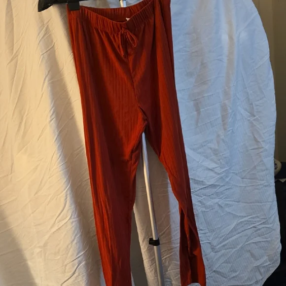 Stylish rust red ribbed pants with a comfortable drawstring waist. Perfect for casual wear.