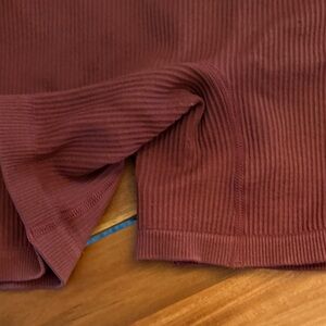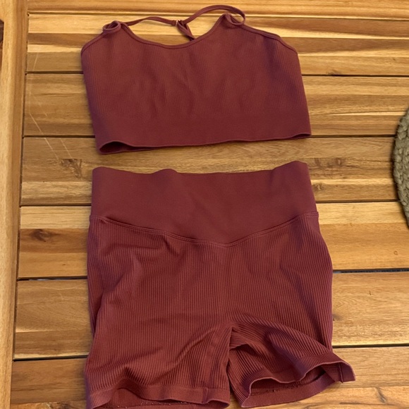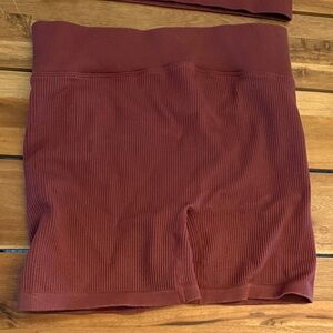 Stylish ribbed two-piece set in rust red. Includes a crop top and shorts. Shorts 3” inseam or so. Pads were taken out of top, happy to include some with request upon ordering.