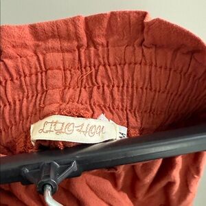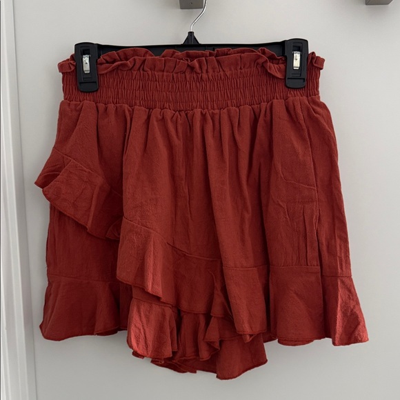 Chic rust red skort with ruffled layers. Perfect for casual outings.