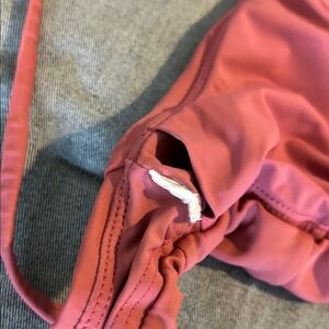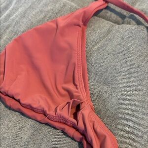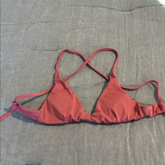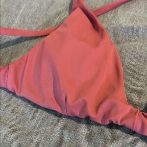 Andie swim triangle bikini top in a warm rose pink color. Cross-back straps and adjustable ties. Smooth, minimalist swimwear style. Removable pads and adjustable straps