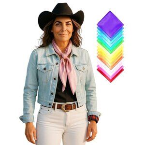 This Rusty Red Brow satin scarf, crafted from silk feel polyester, offers versatile styling. Its smooth texture enhances western attire, pairing seamlessly with hats and boots.