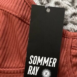 Stylish rust ribbed crop top with adjustable spaghetti straps.