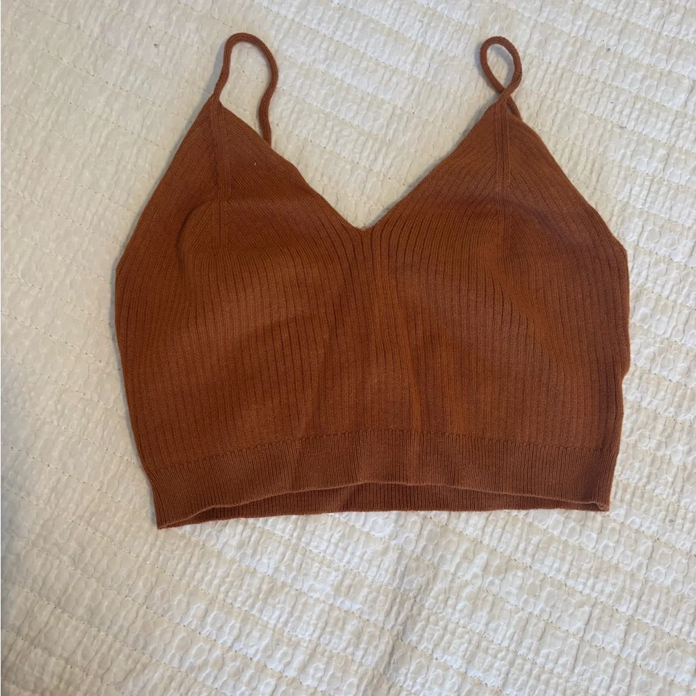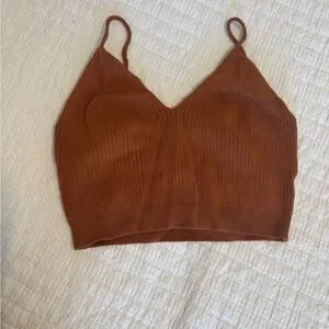 Stylish rust ribbed knit crop top. Features a V-neck and spaghetti straps.