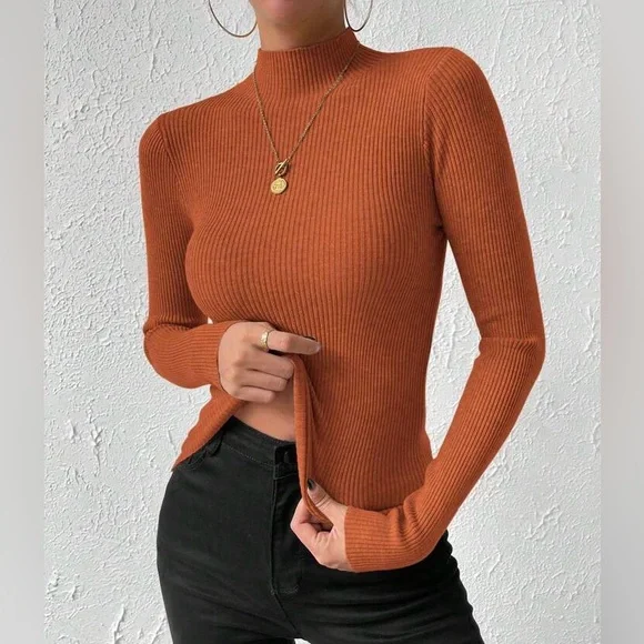 Stylish rust ribbed knit sweater. Perfect for any occasion.
