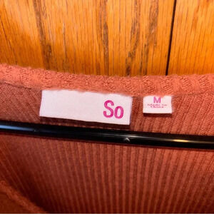 long sleeve SO too, ribbed, fitted, burnt orange, cinched, bow, ruffle sleeves
