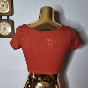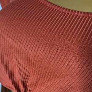 Elevate your style with this chic rust ribbed top. Featuring a trendy knot front design, it's perfect for any occasion.