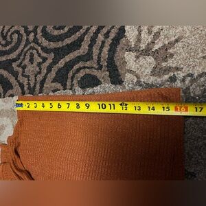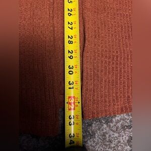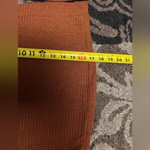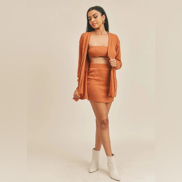 Stylish rust ribbed set comes with a mini skirt elastic waist ,cropped tube top and a cardigan NWOT size is 0XL on the tag but runs smaller like a Medium