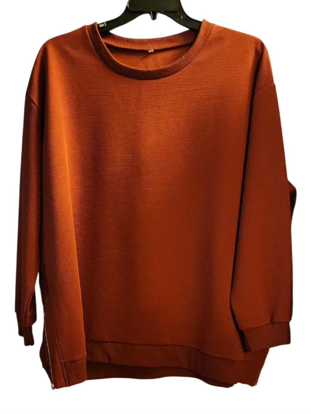 Rust-colored ribbed sweatshirt in size 4XL. The brand tag is missing. Made of 95% rayon and 5% spandex. Machine washable; hang to dry. Features zippers at the bottom of each side and cuffed sleeves. Soft, stretchy, and textured material. Crew neck and oversized fit.
