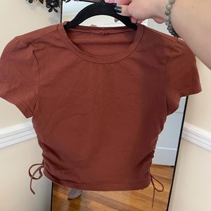 Rust/red rushed crop top t shirt. Can be worn longer (to the belly button) or pulled and tied tighter to be much more cropped. Is size Small but fits Medium