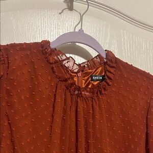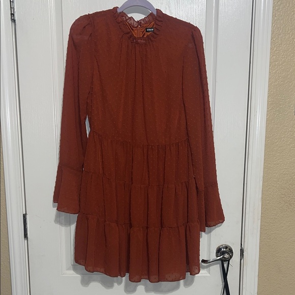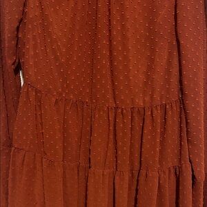 Charming rust-colored tiered dress with a ruffle neckline. Lightweight textured fabric for comfortable all-day wear. Long sleeves and playful tiers create a flattering silhouette. Easy to style for events or everyday wear.