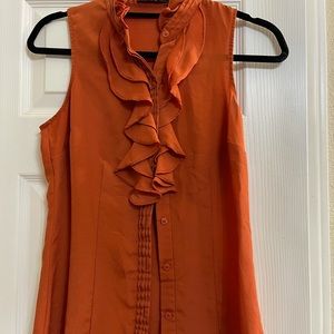 Rust ruffle sleeveless shirt. Rayon feel. Lightweight and cute!! Who doesn’t love ruffles! Ruffles and boots for the fall!