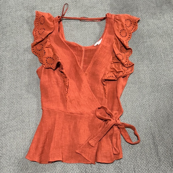 Elevate your style with this chic rust ruffle wrap top. Perfect for any occasion, this top features delicate eyelet details and a flattering tie waist.
