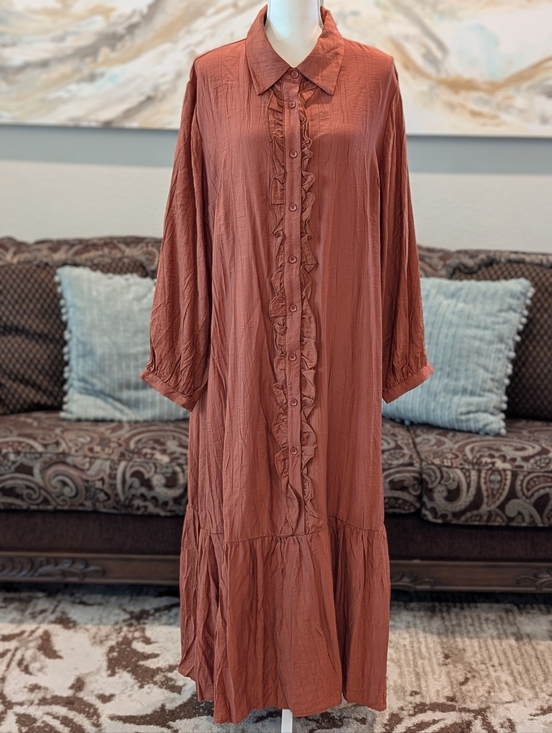 Rust Ruffle-Front Long Button Closure Dress