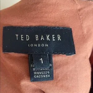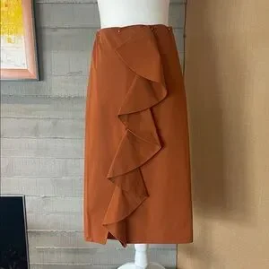 Elegant rust ruffled midi skirt with a cascading front detail. Wears like a pencil skirt. Ted Baker rose gold zip in back. Designed for a polished look that transitions easily from work to events. Comfortable, tailored fit highlights the silhouette. Versatile rust color complements neutral and warm tones.