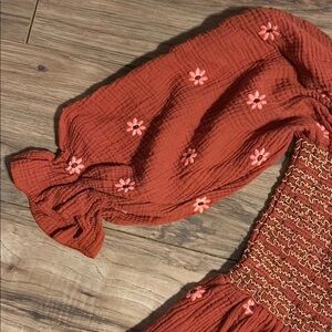 Rust-colored maxi dress with smocked bodice and floral embroidery. Features puff sleeves and a flowing skirt. Top is stretchy