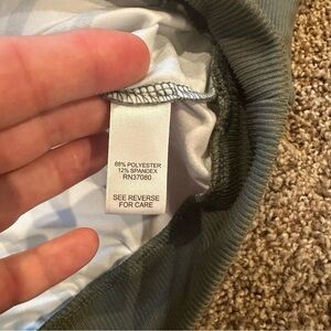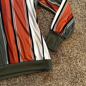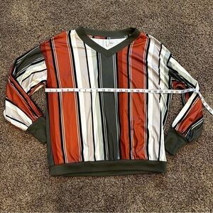 A vintage-inspired top featuring a distinctive rust, dark green, white, and black striped pattern with a crew neck and long sleeves. Size medium. Comes from a smoke free home.