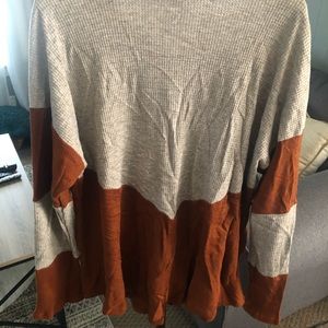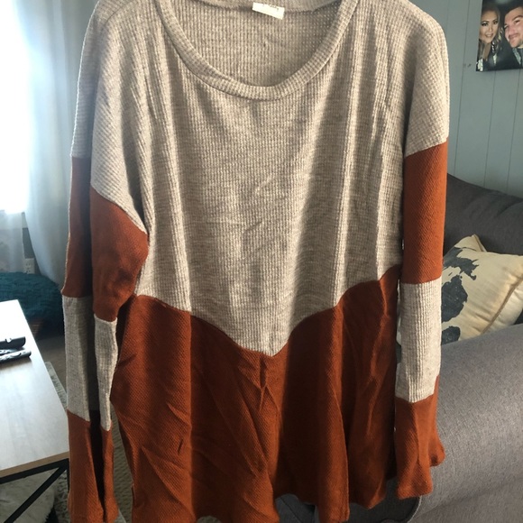 Love this sweater! It has a round hemline and it has a gorgeous rust color. It dips in the front in a V shape. Long sleeve and 50” bust. Only tried on, never worn it washed. Stored in a tote, sorry for the wrinkles!