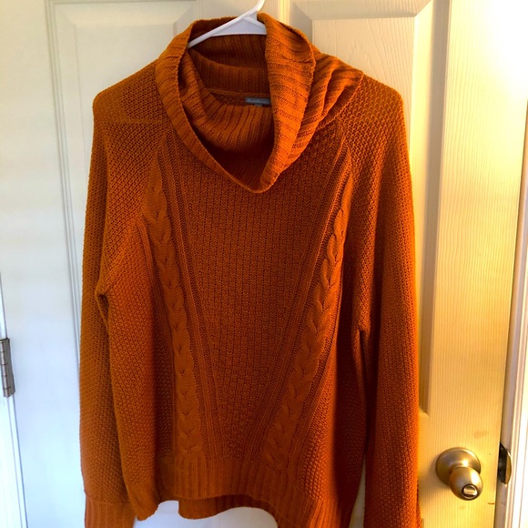 Long sleeve rust/terracotta/burnt orange colored knit sweater. Loose turtleneck front, knit detailing on the front. Only worn once. Comfortable and loose fitting.