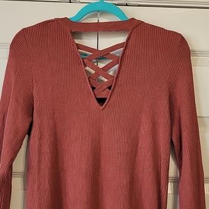 Dark rust color. Criss-cross cutout in back. Size XXL, but I think it fits like a L.