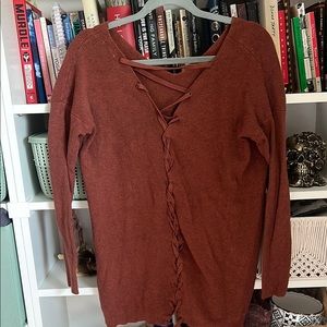 Cozy and stylish rust sweater perfect for any occasion. Enjoy the comfort and warmth of this versatile piece. Crisscross tie down the back