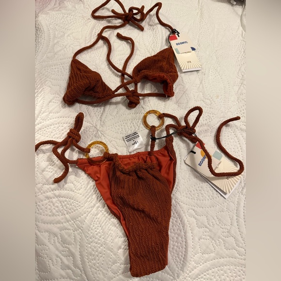 Dive into style with this rust-colored textured bikini set. Perfect for a chic beach look.