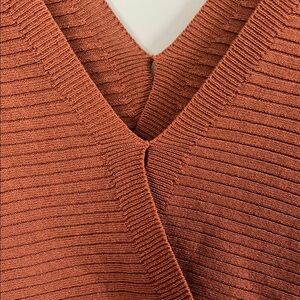 Elegant rust V-neck sweater with ribbed texture and unique back detail. Super soft and beautiful color.