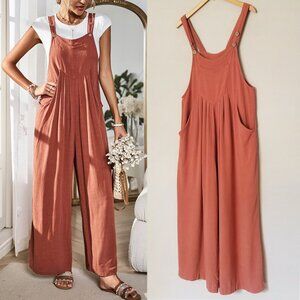 Rust Wide Leg Ankle Jumpsuit S Bib Overall Coverall Side Pocket Boho Linen Blend