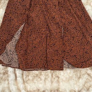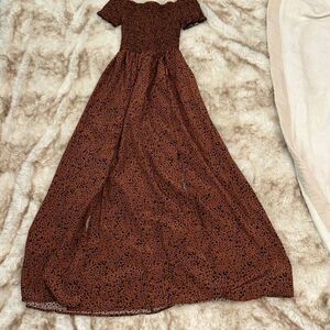 Rust and black cheetah animal print off shoulder smocked midi dress | Sz S