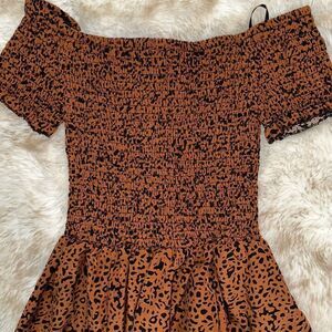 Step out in style with this rust and black cheetah animal print off-shoulder smocked midi dress in size S. This dress is perfect for both casual outings and more formal occasions, offering a flattering and versatile fit that’s sure to turn heads.