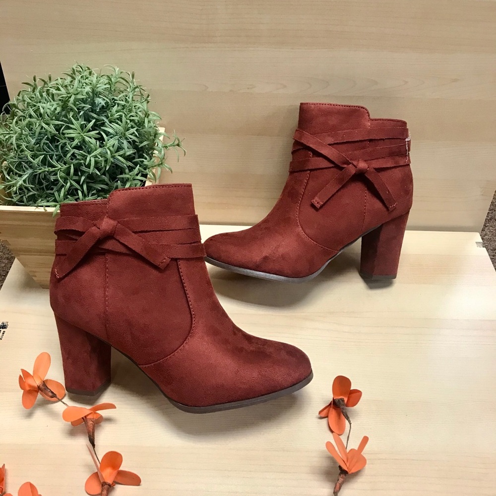 Ladies, check out this rusty brick colored bootie ✨ it has a chunkier heel for comfort and it's faux suede✨ heel is 4" ✨ all pairs in perfect condition / NEW and we double check before shipping . Thankyou for your trust✨