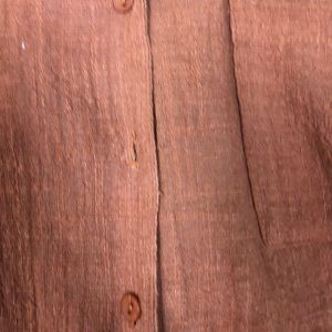 Rust button up with collar, condition used, some damages , missing button , stains on front and back ,white stain on the back all pictured above, Top is true to size thin material size small