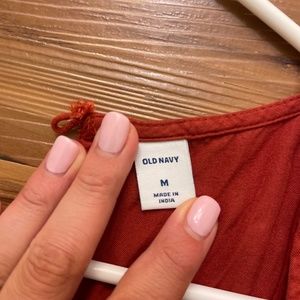 Old Navy size M rust color jumpsuit with pockets and tie waist accent. No stains, holes or tears. Very good condition