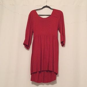 Rust colored dress, back has two buttons at top and a slit down the middle. Slightly longer in the back than front, but not a high-low