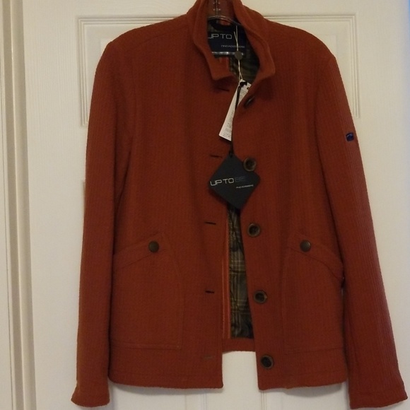 Italian brand Up To Be style Incipit, Italian size 50 (US 14) Waffled fabric in dark orange/rust color. Rare find! Never worn, NWT! Smoke free home. Make an offer and own this luxury Italian jacket. For more info on the brand visit uptobe.it