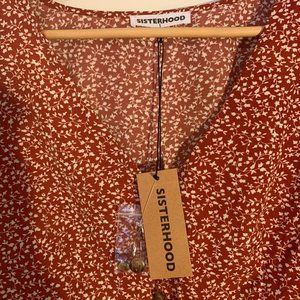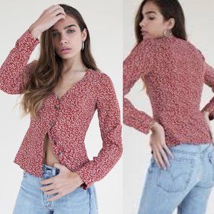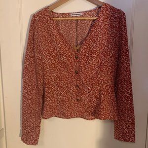 Stunning rust red terracotta blouse with a cream floral pattern. Beautiful button detailing and slight peplum cut. Can be fully buttoned or left slightly open.