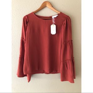 Lightweight rust top features long ruffle bell sleeve top. Back button closure.