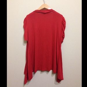 This top has a black shirt with a rust shaw like design attached to the top. Has 3/4 sleeves and Drapes down the front on the sides . New never worn. Have different sizes.