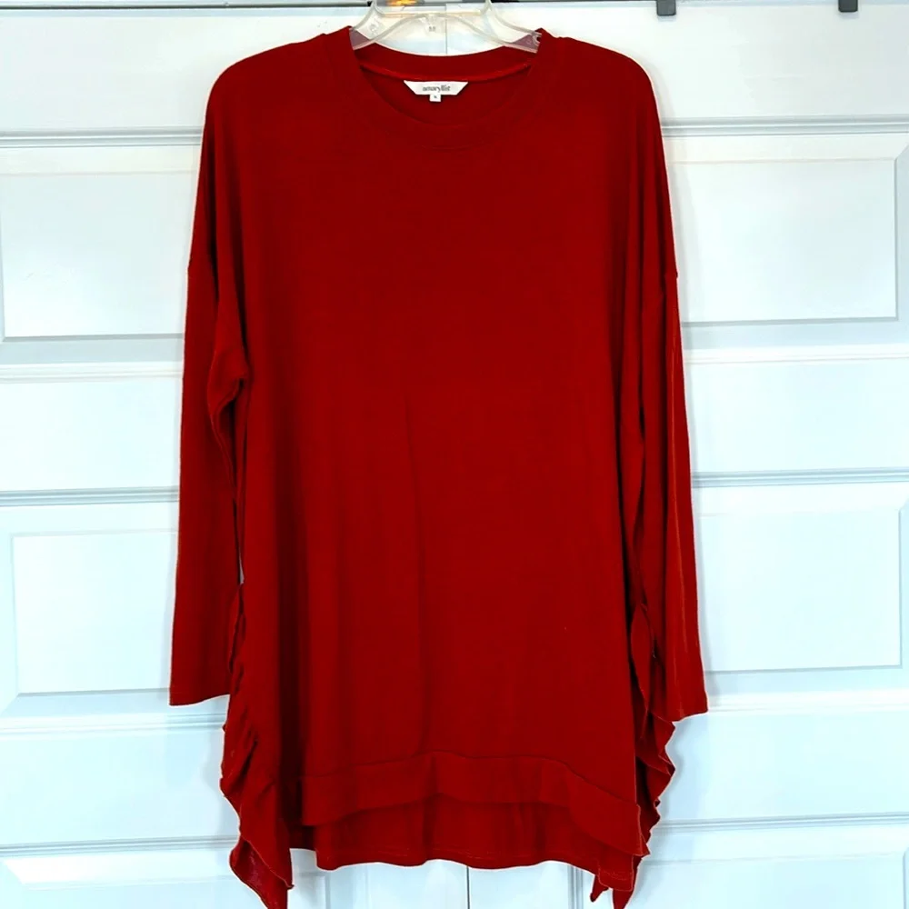 Soft flowy shirt with scoop neck and ruffle detail at slits on side. No rips, tears or stains.