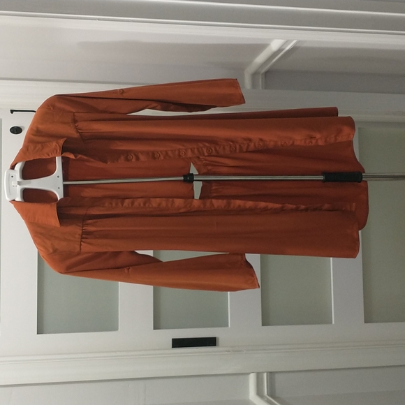Pumpkin color like rust. Opening at the back for added detail. Can be button up.long sleeve.