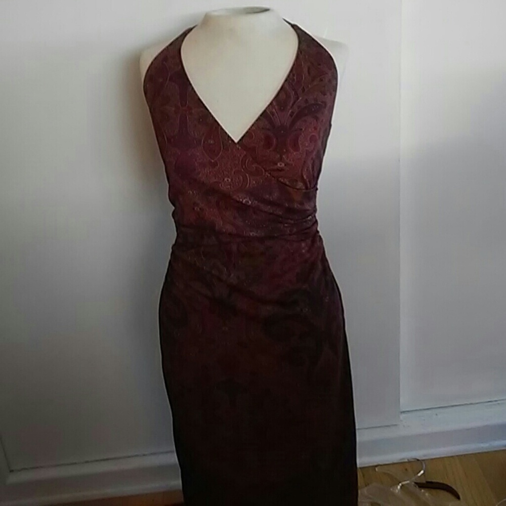 Tie back wrap front look fitted nice Rust/Brown color dress above the knee. Very nice for summer.